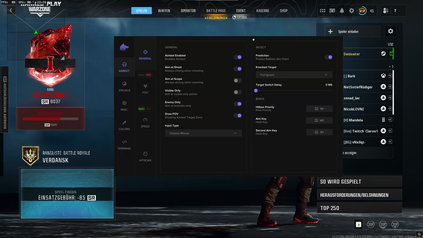 - Player Info (name, distance, weapon, ping, kills, rank)
